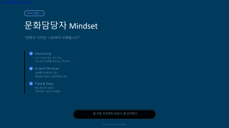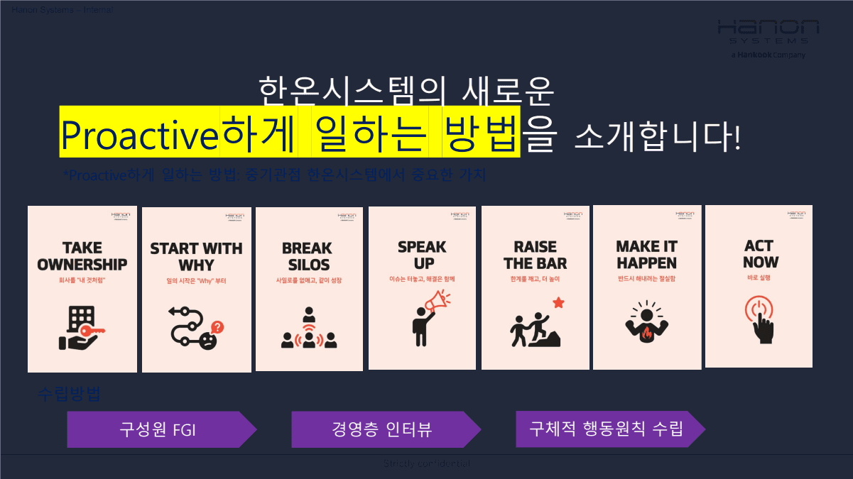 "명확하게 소통하세요" 같은 모호한 워딩은 현장에서 효과적으로 작용하지 않아요. 한온시스템은 구성원의 뇌리에 팍 꽂히는 직관적인 행동 원칙을 세웠는데요.