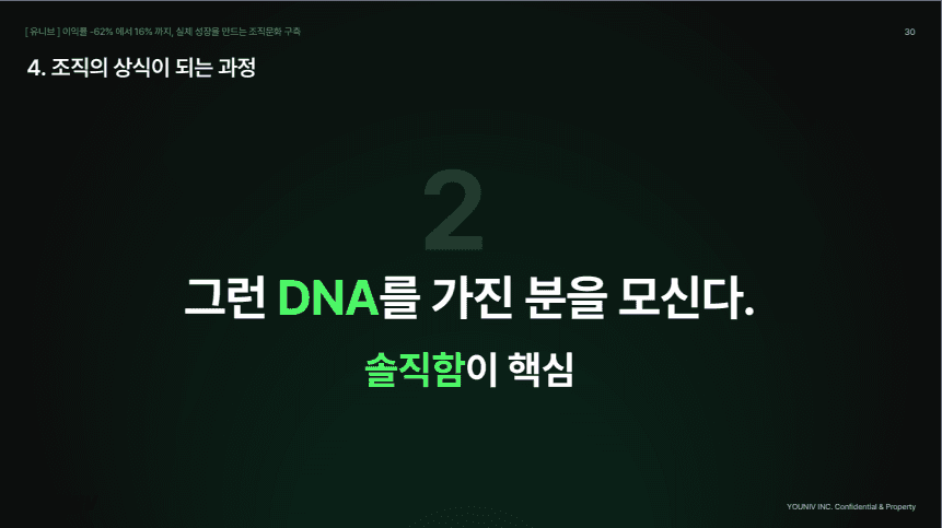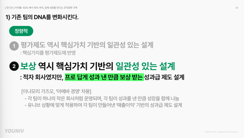 평가와 보상으로 증명하는 핵심가치: 벽에 붙여둔 핵심가치가 진짜 힘을 발휘하려면, 채용부터 평가, 보상까지 모든 HR 시스템이 핵심가치와 연결되어야 하는데요. 유니브는 컬쳐핏 면접을 세분화하여 문화에 맞는 인재를 뽑고, 새롭게 정립한 핵심가치를 실제 직원들의 평가 및 보상 기준표에 완벽하게 연동시켰어요. 그 결과, 문화에 동참하는 직원이 제대로 된 보상을 받게 되자, 조직 전체의 퍼포먼스가 수직 상승했다고 해요.