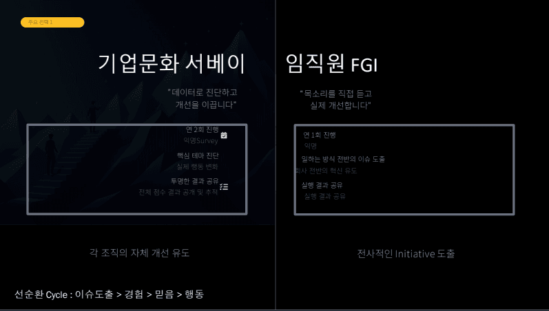 집요하고 구체적인 서베이: 연 2회 익명 서베이를 진행하면서 실제 행동 변화를 주제로 문항을 매우 날카롭게 구성했어요. 이외에도 임직원 FGI를 연 1회 진행해 회사 전반의 혁신을 유도하고 주도적인 문화 개선을 유도했죠.