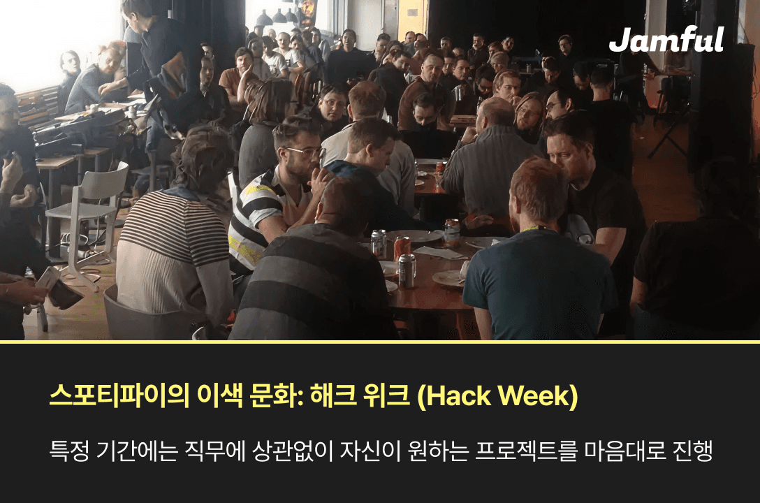 해크 위크 (Hack Week): 스포티파이는 일주일에 한 번, 혹은 특정 기간 동안 직원들은 본업에서 벗어나 하고 싶은 프로젝트를 마음대로 진행하고 있어요. 개발자가 디자인을 해도 좋고, 마케터가 코딩을 해도 좋은데요. 엉뚱해보일 수 있는 이 문화로 스포티파이의 수많은 혁신적인 기능들이 탄생했다고 해.