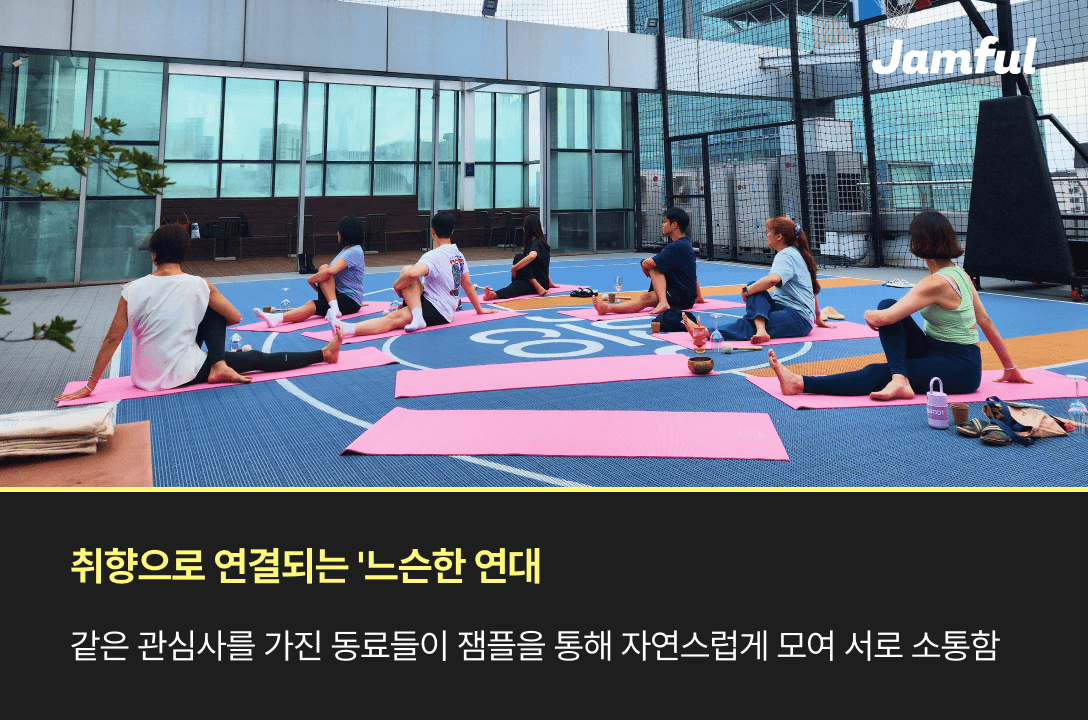 취향으로 연결되는 '느슨한 연대': 클라이밍, 테니스, 요가 등 같은 관심사를 가진 동료들이 잼플을 통해 자연스럽게 모이고 대화를 시작해요. 굳이 애쓰지 않아도, 함께 땀 흘리고 취미를 공유하는 과정에서 끈끈한 동료애가 싹트게 되죠.
